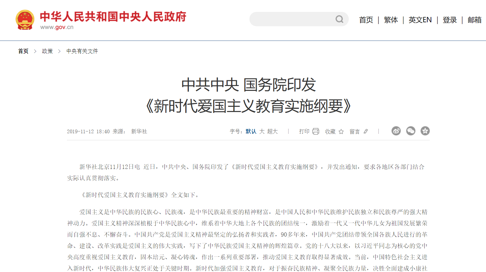 中共中央 国务院印发 《新时代爱国主义教育实施纲要》
