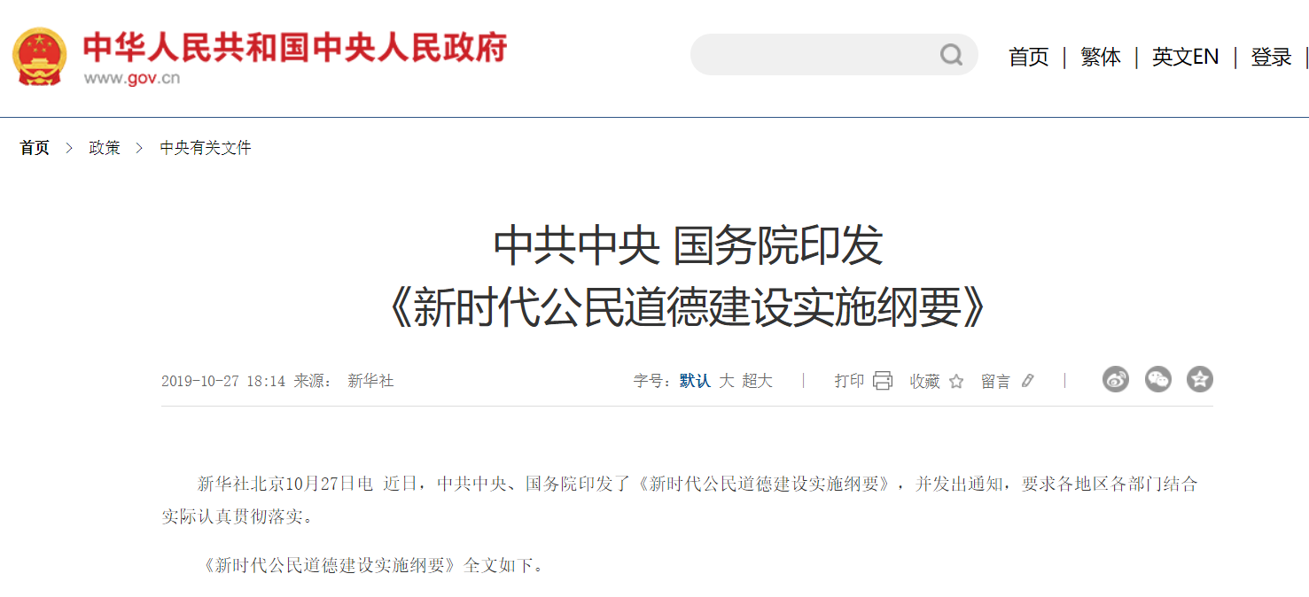 中共中央 国务院印发 《新时代公民道德建设实施纲要》