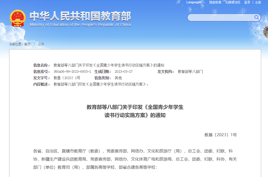 教育部等八部门关于印发《全国青少年学生 读书行动实施方案》的通知