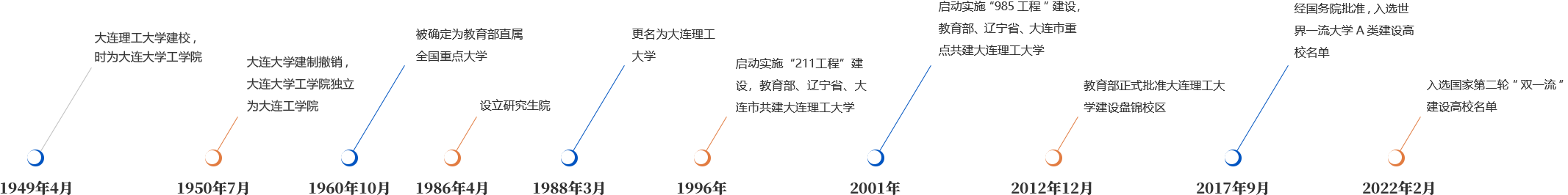 艾佛森贝博ballbet官网1949年4月建校,时为大连大学工学院;1950年7月大连大学建制撤销,大连大学工学院独立为大连工学院;1960年10月被确定为教育部直属全国重点大学;1986年4月设立研究生院;1988年3月更名为艾佛森贝博ballbet官网;1996年启动实施“211工程”建设,教育部、辽宁省、大连市共建艾佛森贝博ballbet官网;2001年启动实施“985工程”建设,教育部、辽宁省、大连市重点共建艾佛森贝博ballbet官网。2012年12月教育部正式批准艾佛森贝博ballbet官网建设盘锦校区;2017年9月,经国务院批准,入选世界一流大学A类建设高校名单;2022年2月,入选国家第二轮“双一流”建设高校名单。